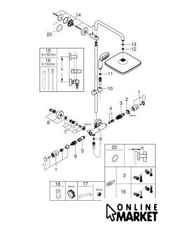 | Комплектация | верхний душ, штанга, ручной душ (лейка), держатель лейки, шланг, смеситель |