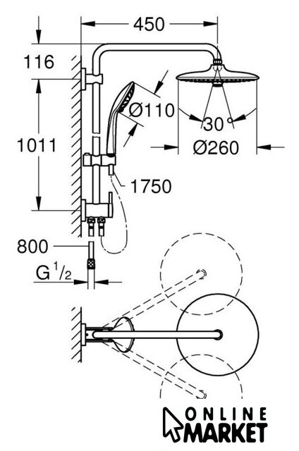 | Диаметр (ширина) верхнего душа | 260 мм |