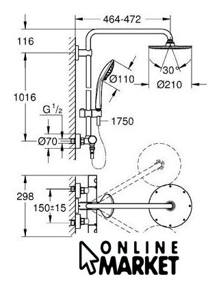 | Вылет верхнего душа | 472 мм |