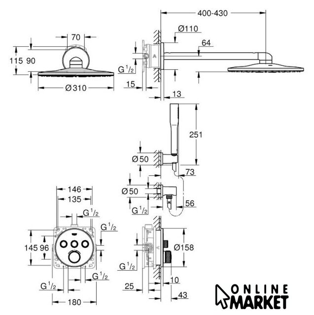 | Диаметр (ширина) верхнего душа | 310 мм |