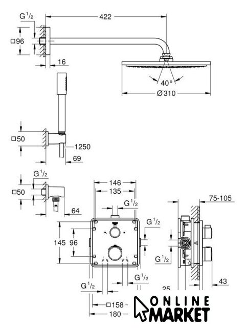 | Диаметр (ширина) верхнего душа | 310 мм |