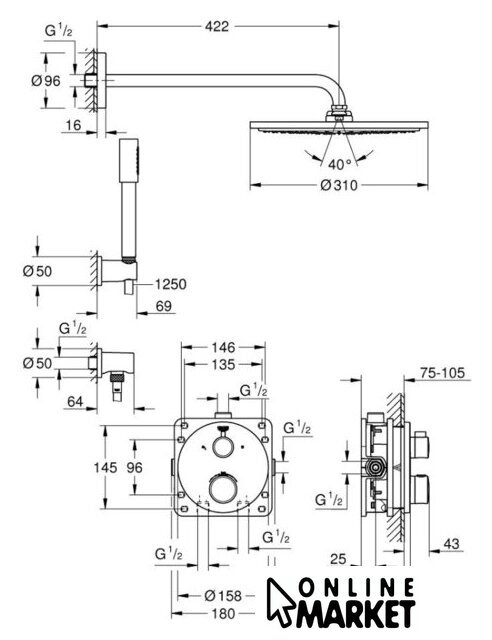 | Диаметр (ширина) верхнего душа | 310 мм |