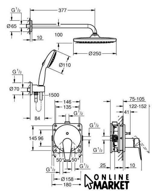 | Комплектация | верхний душ, ручной душ (лейка), держатель лейки, шланг, смеситель |