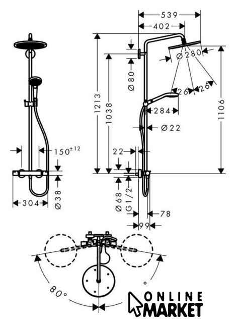 | Диаметр (ширина) верхнего душа | 280 мм |