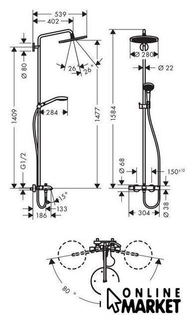| Диаметр (ширина) верхнего душа | 280 мм |