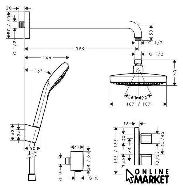 | Комплектация | верхний душ, штанга, ручной душ (лейка), держатель лейки, шланг, смеситель |