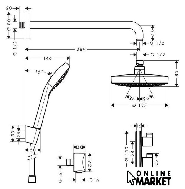 | Комплектация | верхний душ, ручной душ (лейка), держатель лейки, шланг, смеситель |