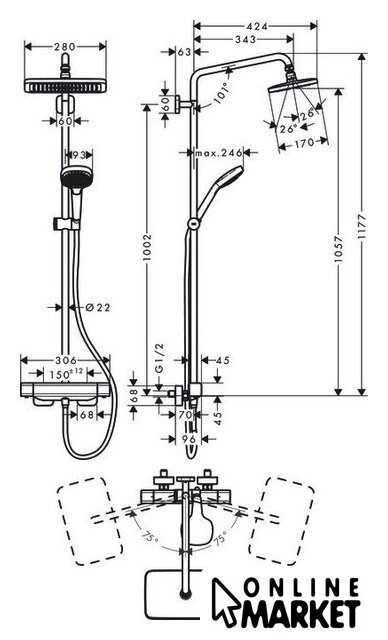 | Диаметр (ширина) верхнего душа | 280 мм |