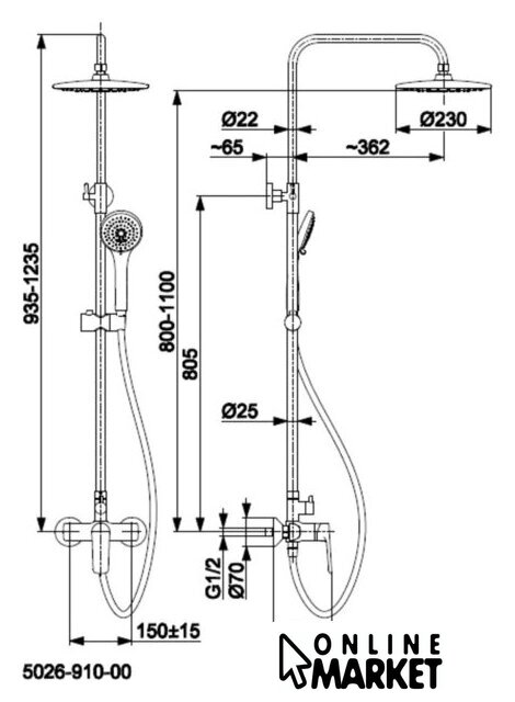 | Диаметр (ширина) верхнего душа | 230 мм |