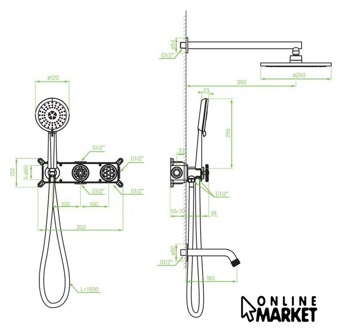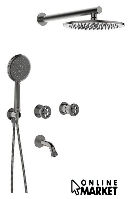 | Комплектация | верхний душ, ручной душ (лейка), держатель лейки, шланг, смеситель, излив для ванны |