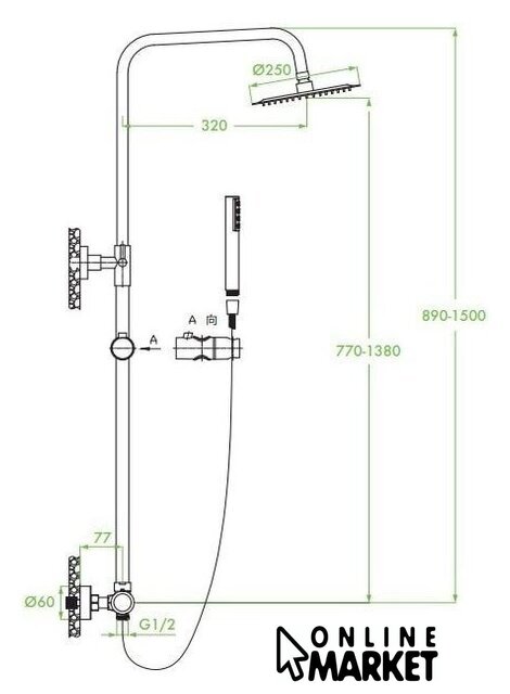 | Комплектация | верхний душ, штанга, ручной душ (лейка), держатель лейки, шланг, смеситель |