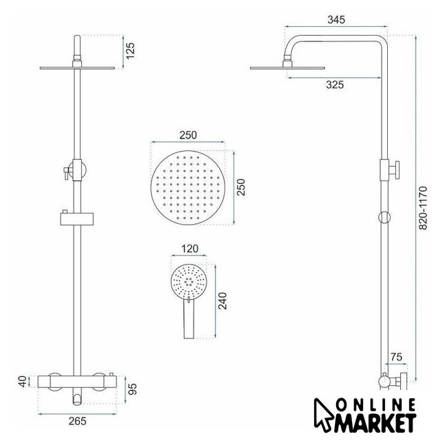 | Диаметр (ширина) верхнего душа | 250 мм |