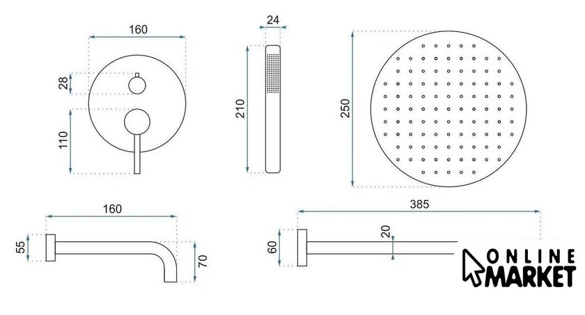 | Диаметр (ширина) верхнего душа | 250 мм |