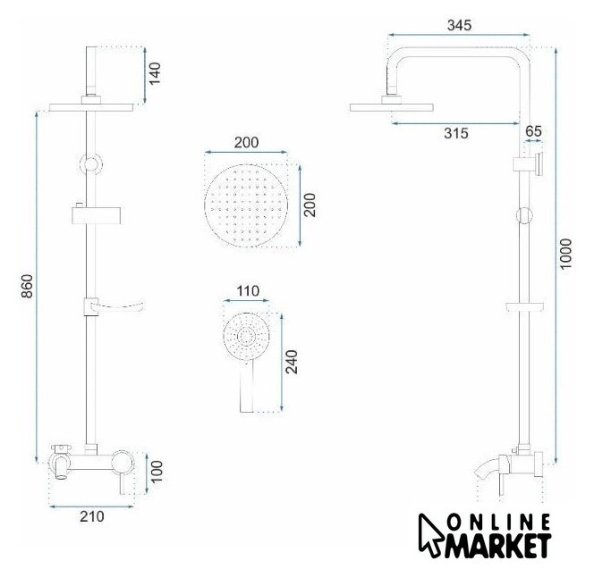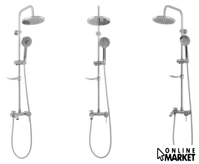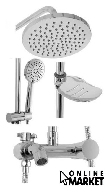 | Комплектация | верхний душ, штанга, ручной душ (лейка), держатель лейки, шланг, смеситель, излив для ванны, мыльница или держатель для мыла |