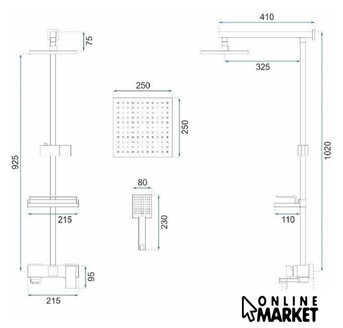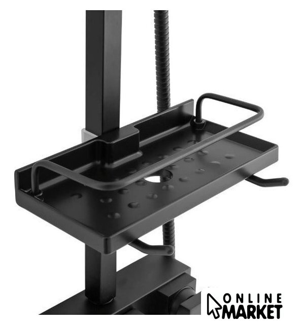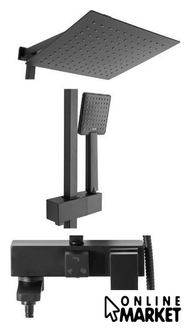 | Комплектация | верхний душ, штанга, ручной душ (лейка), держатель лейки, шланг, смеситель, излив для ванны, полочка |