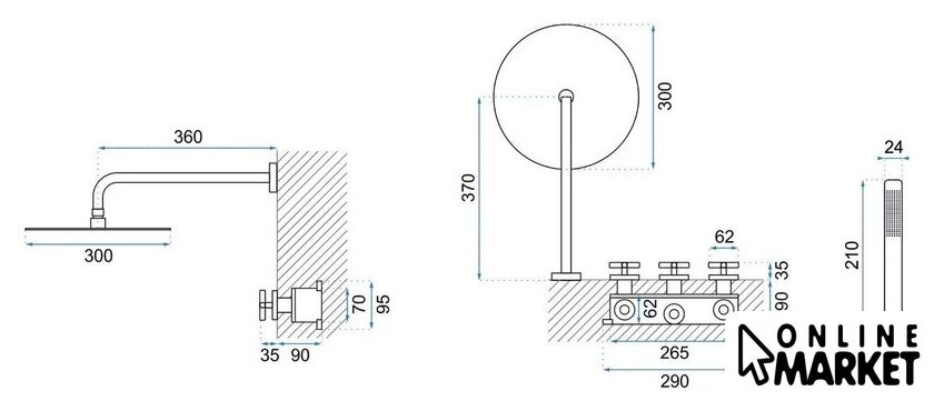 | Комплектация | верхний душ, ручной душ (лейка), держатель лейки, шланг, смеситель |