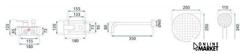 | Комплектация | верхний душ, ручной душ (лейка), держатель лейки, шланг, смеситель |