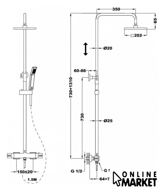 | Комплектация | верхний душ, штанга, ручной душ (лейка), держатель лейки, шланг, смеситель |