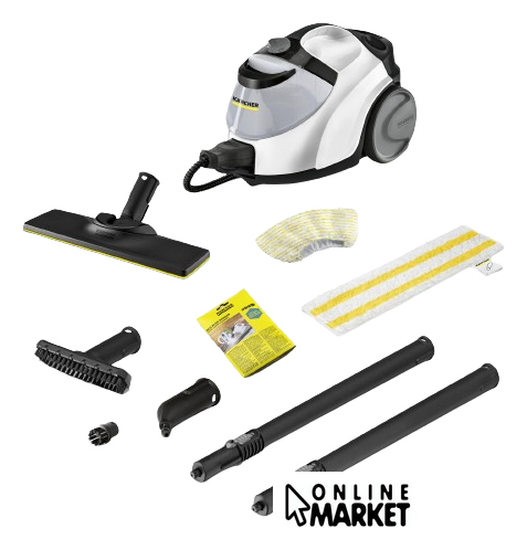 Дополнительные насадки и приспособления | - Универсальная салфетка для пола EasyFix;- Микроволоконная обтяжка для ручной насадки;- Порошковый антинакипин: 3 шт;- Точечное сопло;- Ручная насадка;- Малая круглая щетка (черная);- Насадка для пола: EasyFix;- Удлинительные трубки (2 × 0,5 м). |