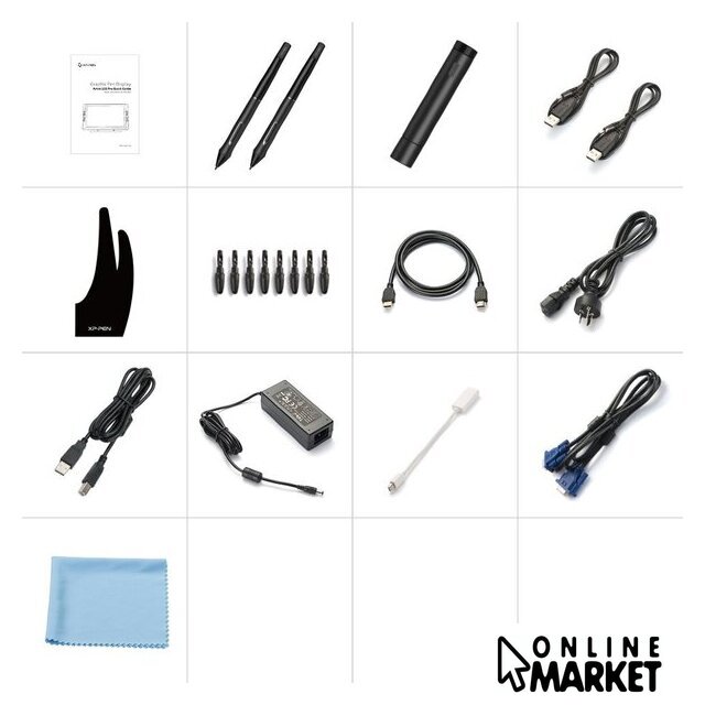 Комплект поставки | - дисплей;- перо с подставкой и сменными наконечниками;- пенал для пера;- кабели HDMI, USB, DVI, VGA;- адаптер DisplayPort;- адаптер питания;- зарядный кабель для пера;- перчатка;- ПО и документация; |