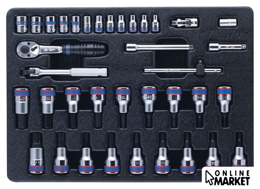 | Комплектация | - Головка торцевая стандартная шестигранная 1/4", KING TONY серии 2335M: 4, 4.5, 5, 5.5, 6, 7, 8, 9, 10, 11, 12, 13- Насадка (бита) торцевая 1/2", TORX, L = 60 мм KING TONY серии 4023: 20, 25, 27, 30, 40, 45, 50, 55, 60- Насадка (бита) торцевая 1/2", HEX, L = 60 мм KING TONY серии 4025: 3, 4, 5, 6, 7, 8, 10, 12, 14- Кардан 1/4" KING TONY 2792- Держатель вставок (бит) 1/4">1/4" KING TONY 2141- Трещотка 1/4", 140 мм, 24 зубца, флажковая, фиксатор KING TONY 2779-55G- Удлинитель 1/4", 100 мм KING TONY 2221-04- Удлинитель 1/4", 50 мм KING TONY 2221-02- Вороток 1/4", 125 мм, с шарниром KING TONY 2452-05F- Вороток 1/4", 115 мм, скользящий KING TONY 2571-45- Ложемент |