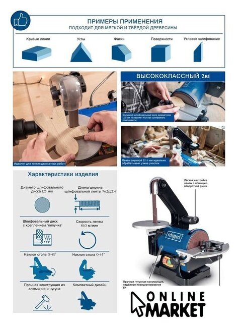 | Комплект поставки | - Ленточная и дисковая шлифовальная машина- Стол для шлифовальной ленты- Всасывающее отверстие для ленточных шлифовальных машин- Поперечный режущий калибр- Регулируемый шлифовальный стол- Зажимной винт М6 2 шт.- Шайба Ø6 2 шт.- Крестообразный винт M4x10 3 шт.- Шайба Ø4 3 шт.- Зажимной рычаг M8 1 шт.- Шайба Ø8 1 шт.- Руководство по эксплуатации |